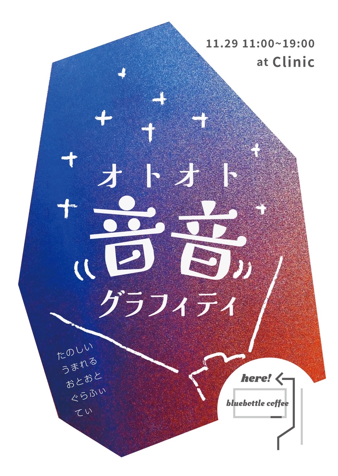 ブルーボトルのおとなりのギャラリーclinicで開催される音音グラフィティ(オトオトグラフィティ)は、エンジニアスズキサトシと壁画ペインターすまあみ、ASOMANABOディレクター大澤麻衣による“デジタル×アナログ×オト”の落書きアートプロジェクト。